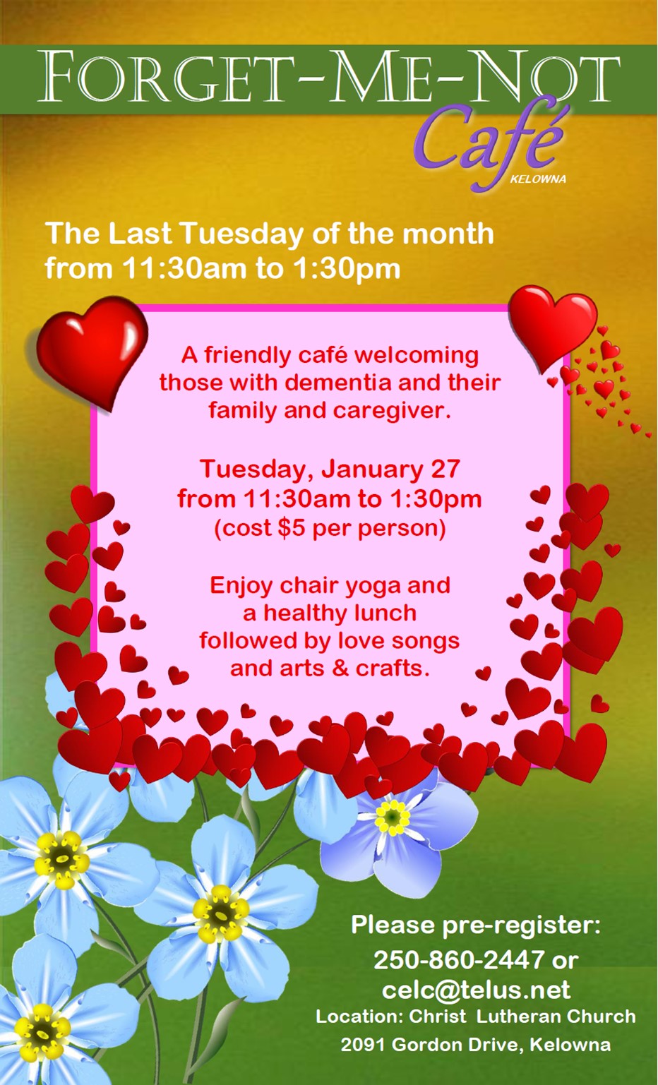 A friendly cafe welcoming those with Dementia and their family and care giver. Cost $5 per person.